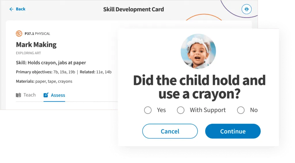 Ongoing guided assessment dynamically updates Individualized Child Plans and sets GOLD preliminary levels.